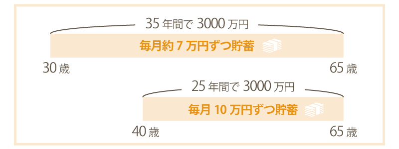 もし40歳の場合は、65歳までの25年間で3000万円貯めなければなりませんので、毎月10万円ずつ貯金が必要です。