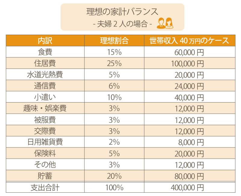 下記の表は、夫婦2人の場合の理想の家計バランスを示したものです。