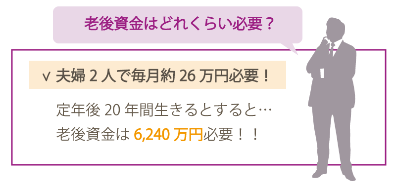 定年後に20年間生きたと想定すると、月26万円×12か月×20年=6,240万円の老後資金が必要になると言えます。