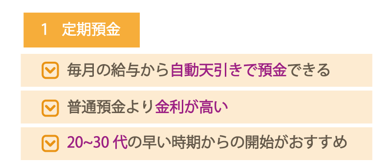 最初に設定した期間内は解約できない、というケースが多く、毎月の給与から自動的に定期預金として天引きすることもできます。