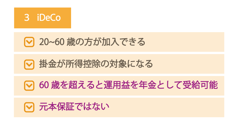 20歳から60歳までの方が加入することができ、毎月の掛金を支払いご自身で選択した金融商品を利用して資産を運用することが可能です。
