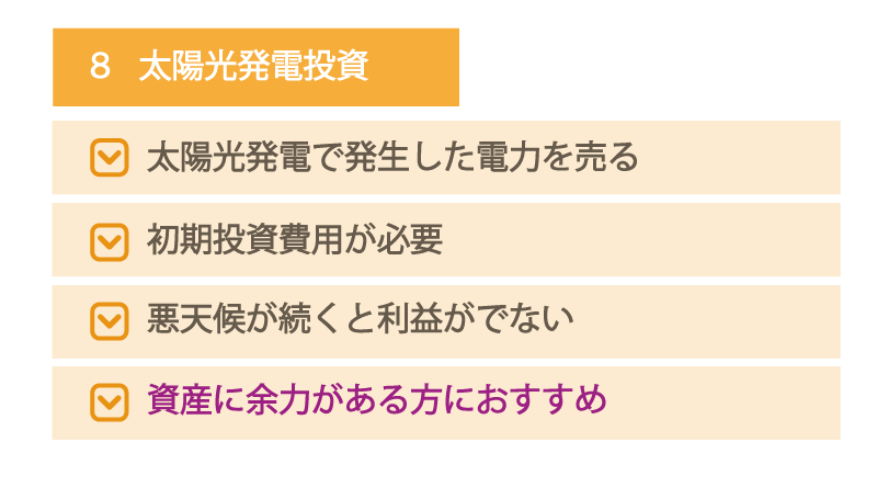 これまで投資の経験がある方や資金に余力がある場合に利用すると良いでしょう。太陽光発電投資