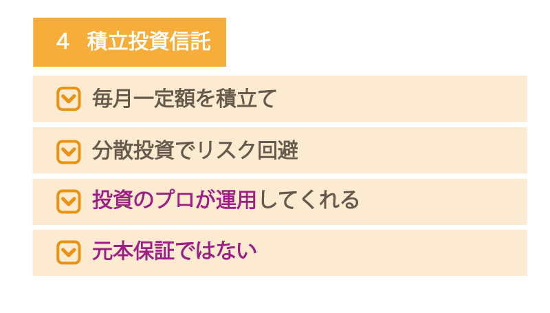 しかし、つみたてNISAと違い、分配された金額などに対して税金が発生することや、信託会社を利用する際に手数料が発生すること、元本割れの可能性があることなど、いくつかの注意点があるので事前にチェックしておきましょう。