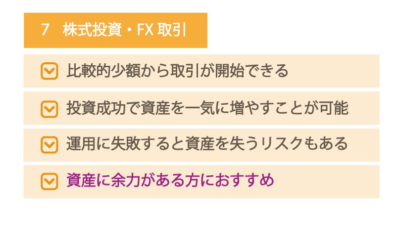 投資に成功すると資産を一気に増やすことも可能ですが、逆に投資に利用した資産をすべて失ってしまうリスクもあるので注意が必要です。