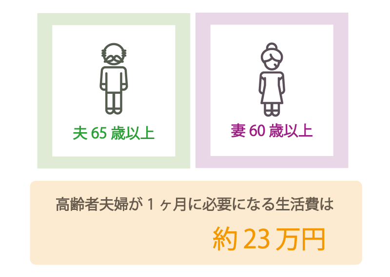 総務省の家計調査【https://www.stat.go.jp/data/kakei/2.html】によると、高齢者夫婦(夫65歳以上・妻60歳以上)の世帯が一か月に必要になる生活費は約23万円となっています。